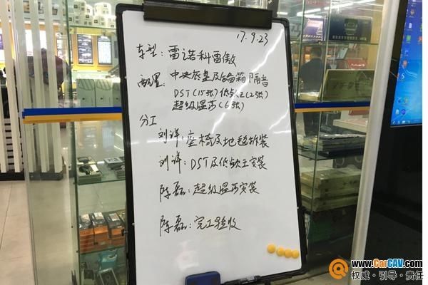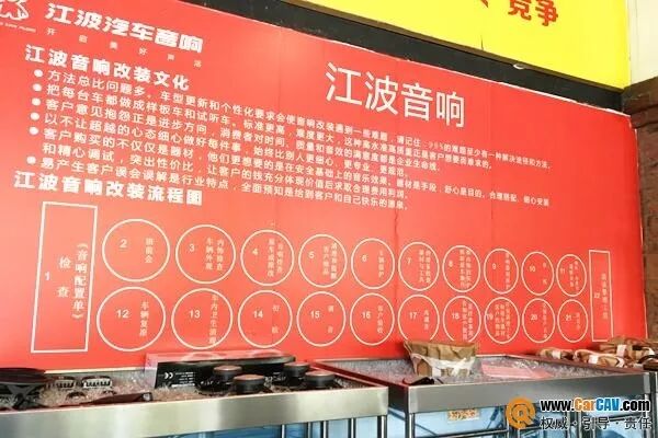 改装车间,相应江波音响改装文化以及改装流程在施工区域的墙上得到充分展示,在给内部员工做到警示的同时也给车主提供了相应改装的参考标准,做到让车主满意放心