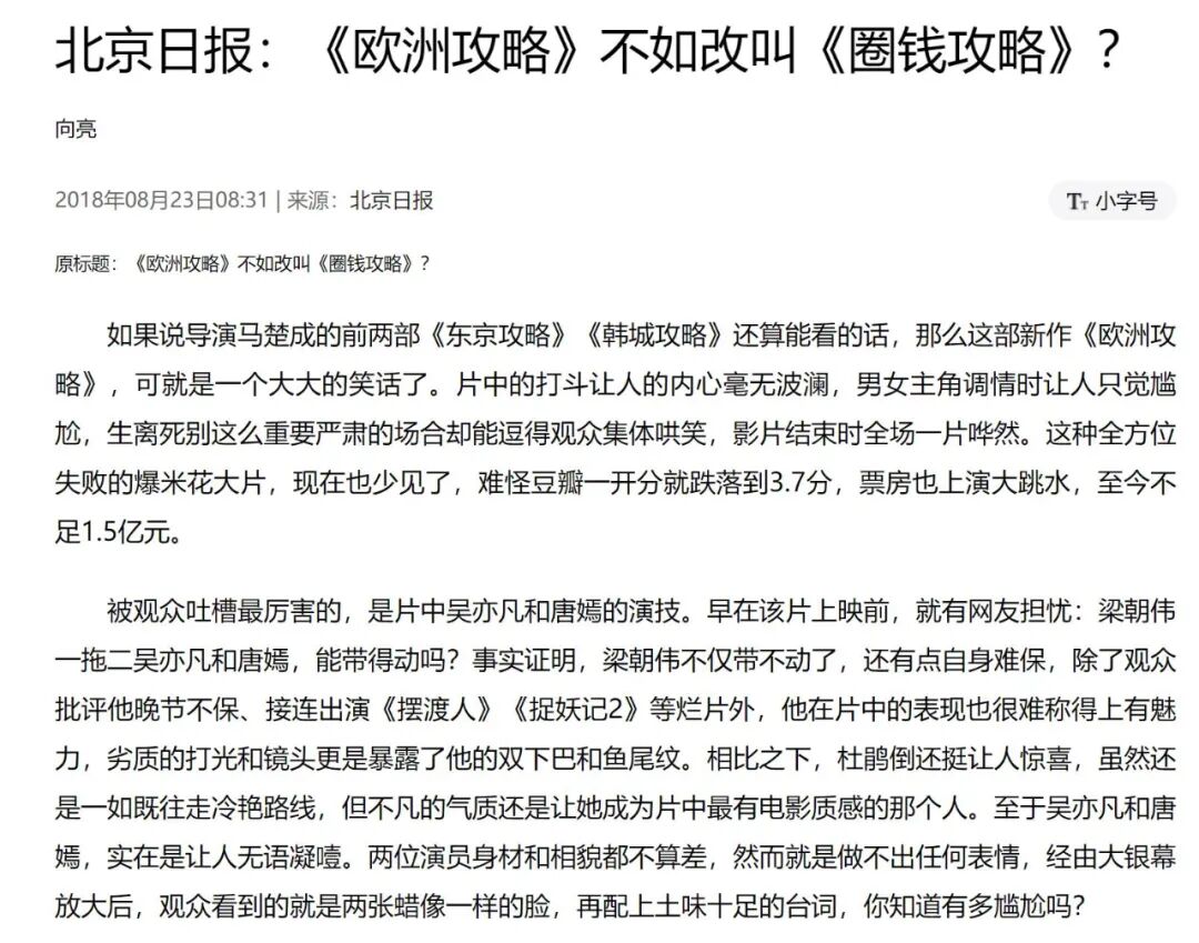 关于吴亦凡演技的梗大部分来自于电影《原来你还在这里》,“菩萨知道我有多难过”的表情包,但他真正在电影界真正的败走麦城还是《欧洲攻略》,这部梁朝伟也无法挽救的电影,以1.5亿票房终结了吴亦凡对影片有票房贡献的传说。作为偶像,有人骂不怕,没人讨论比较可怕。