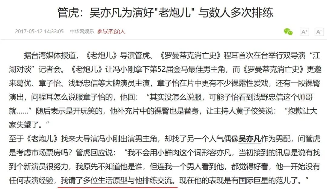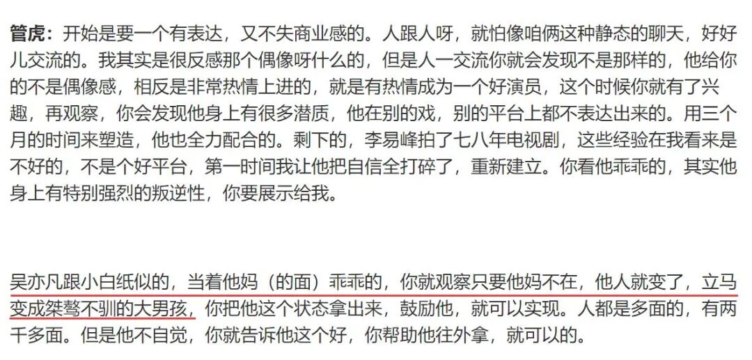 在一次导演协会的活动上,管虎提起吴亦凡李易峰时说:你要跟他们一起交流,都是爹妈生的特好的孩子,但要把他们剥离出被经纪人包围的环境。