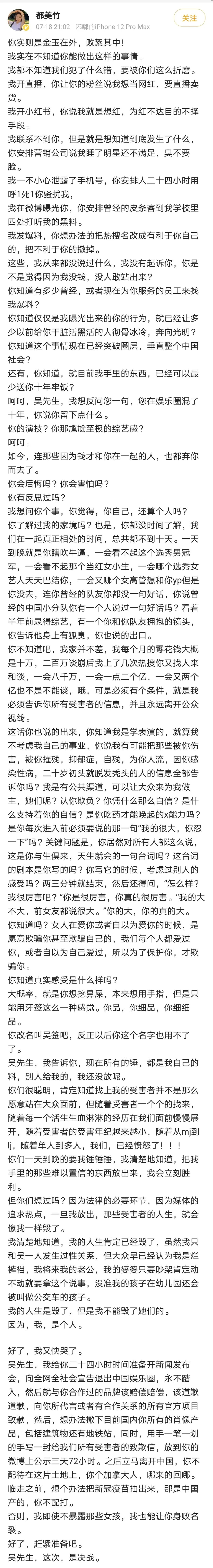 都美竹昨晚下了24小时限时令,结合她之前的微博, 对吴的指控有:疑似对不满18岁的少女灌酒、“迷奸”,以选新人的借口组织“选妃”,在都爆料后协商转账。