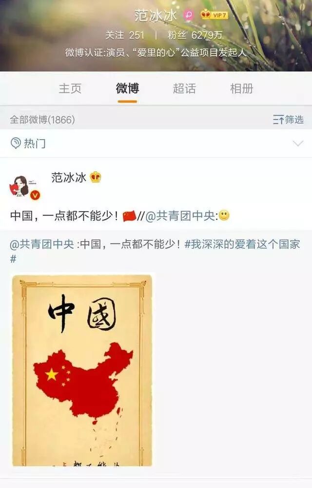 本届金马奖不幸惹上两岸政治风暴,很多艺人纷纷发微博表明态度,在微博转发“中国,一点都不能少”贴文。