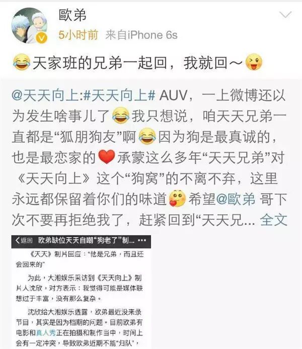 面对欧弟的酒后吐真言,《天天向上》官微做出下面这样的回答,可是欧弟似乎并不买账。一句“天家班的兄弟一起回,我就回”,言下之意,不是我不想回《天天向上》,也并非官微所说的,一直在邀请他回来却遭到他拒绝,而是节目中的所作所为让人寒心,兄弟散了,有家跟没家,还有什么区别。