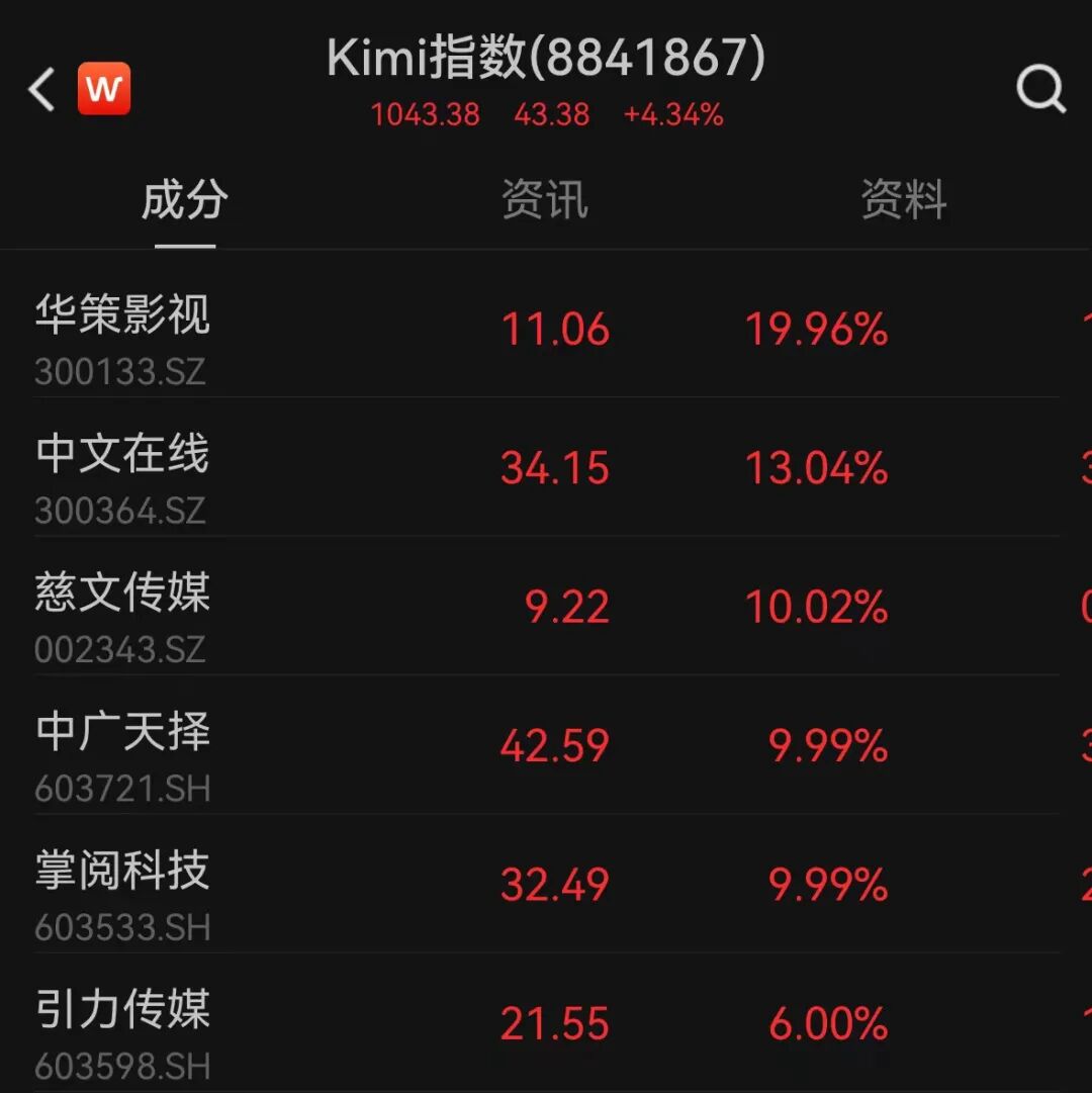 3月22日,A股出现集体下跌,超过4600只个股下跌调整,但在此背景下,Kimi概念股掌阅科技(603533.SH)、中广天择(603721.SH)再度涨停,华策影视(300133.SZ)等个股跟涨。