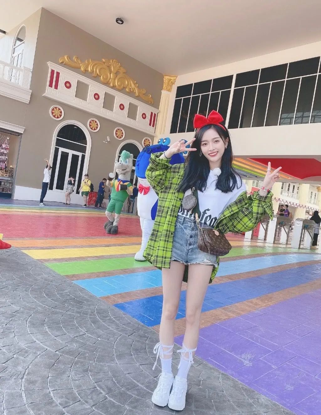 多数时刻,吴宣仪还是表现出小女生的清新个性,一个甜美的蝴蝶结发箍就带来青春减龄感,撞色格纹衫与牛仔短裤的休闲搭配,将小女生的清纯靓丽气息展示得淋漓尽致。