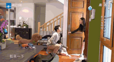《爸爸回来了》里的杜江,眼看着要走的霍思燕一脸不舍,蹲在地上要亲亲,伸长的脖子都在说“爱你”。