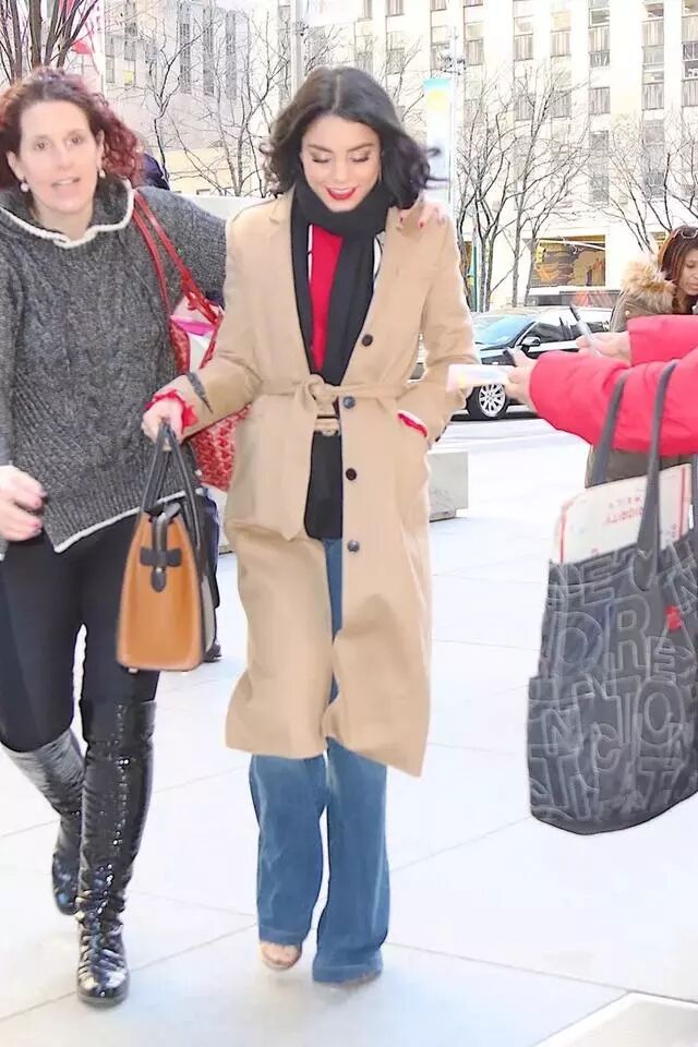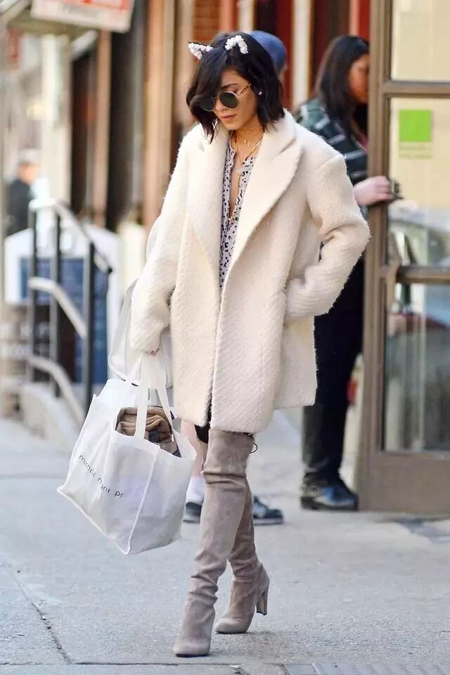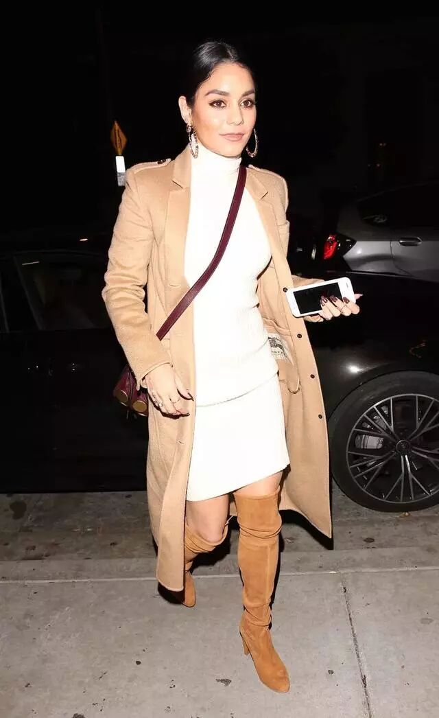 3.适当露肤,少量留白会让厚重的冬天有了一丝透气感,更加显高,Vanessa Hudgens最喜欢露的位置是如下图的脚踝和领口。