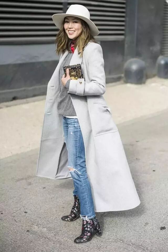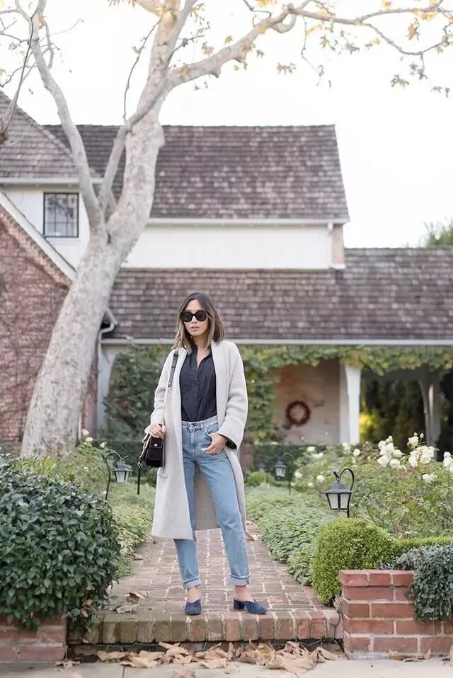 素色的长大衣也许会给人比较正式的感觉,所以混搭牛仔裤进行综合就可以巧妙化解,款式上,选择高腰款为主。