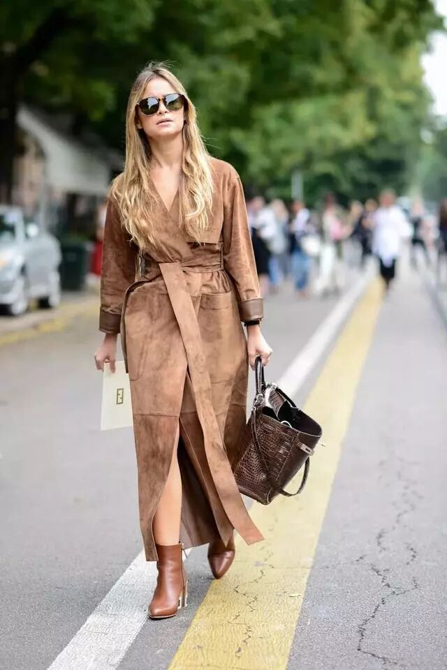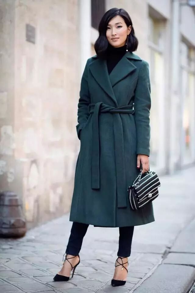 尖头高跟鞋能无形将腿部延长,再加上一件系带长大衣身材比例更加出众,冷一点的话,可以穿上黑色长裤在大衣里。