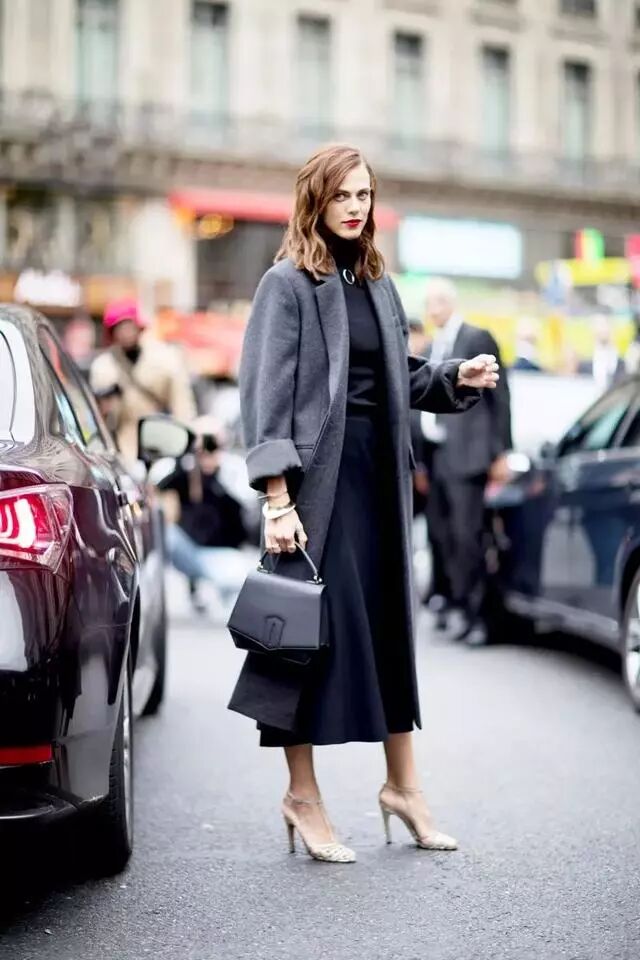 她基本上选择的都是长大衣,搭配技巧不会太多,在高跟鞋上的法则是:一定要露脚背或脚踝。