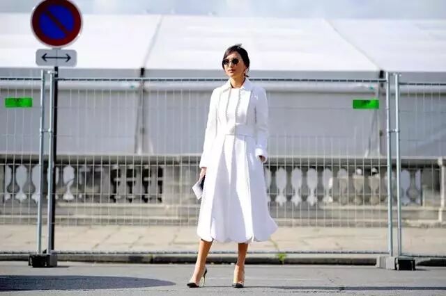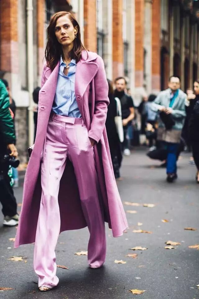 与此同时,在外套为浅色的基础之上,下装尽量保持以浅色为佳,带来轻盈感,不会太压抑,你可以选择整身浅色调的顺色,或是上深下浅的搭配方式。