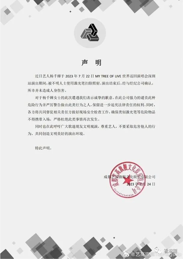 就今次事件,主办方成都艺高旗舰文化娱乐有限公司昨日在官方社交网就此事发声明,对千嬅表示歉意,并强烈谴责该行为:“近日艺人杨千嬅于2023年7月22日MY TREE OF LIVE世界巡回演唱会深圳站演出期间,被不明人士使用激光笔扫脸照射。演出结束后,经与经纪公司确认,所幸并未造成人身伤害。对于杨千嬅女士的此次遭遇我们表示诚挚的歉意。在此公司强力的谴责此种危险行为并严厉警告做出此类行为之人,保留进一步追究法律责任的权利。”又强调会督促相关责任方做好现场安全检查工作,确保类似激光笔等危险物品不得携带入场,严格杜绝此类事情再次发生,并呼吁歌迷要文明观看演出及尊重艺人,不要采取危害他人的行为。