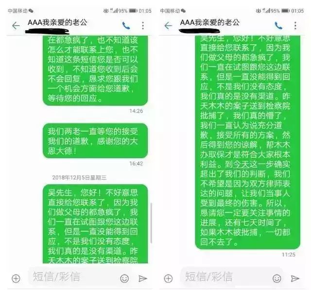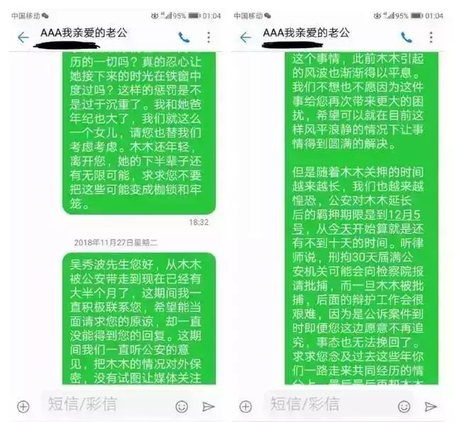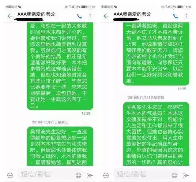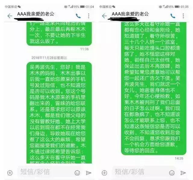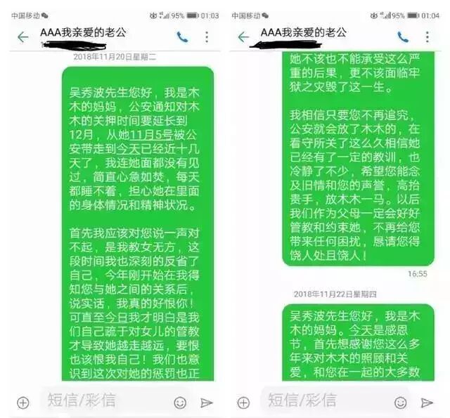 从短信内容来看,女子的母亲为了救女子,多次联系小吴,但小吴没有任何回应看来,他决心把“小三”送进监狱了并且在短信的备注上意外的向她透露了吴秀波的昵称:AAA我亲爱的老公