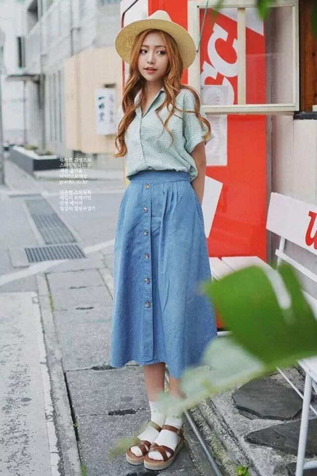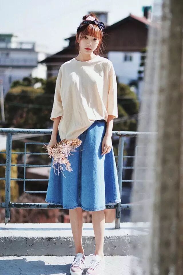 想要森女风的文艺范儿,你的牛仔裙不能太短,不能太紧,偏休闲一些的大裙摆牛仔裙更合适哦,而且专业遮肉30年!建议身高160以上的妹子们酌情选择适合自己的长度!