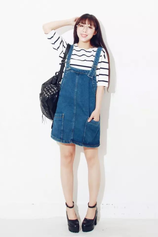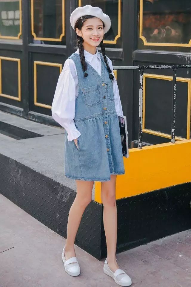 要是你想要更减龄、清纯一点,就选牛仔背带裙,背带装一直是减龄利器,内搭T恤就能轻松出彩!