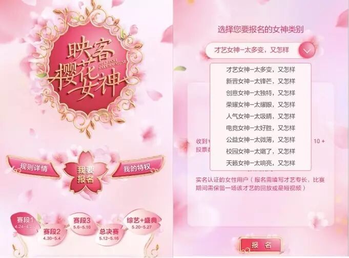 而究竟,这次让映客花了重金集结半个娱乐圈的“樱花女神”是什么呢?简单来说,这一次樱花女神的选举是“海选”和“直播”完美结合的新玩法,既勾起了许多人当年经历过的素人“全民海选”的疯狂,又把“直播”这样的最简单的“全民参与”融入其中。映客开辟了校园、电竞、天籁、创意、真爱10个专门赛道,比赛分为三个阶段,每个赛段的第一名会晋升到《樱花学院》担任嘉宾,与明星男神进行互动,最后参加众星云集的樱花女神星光夜的颁奖典礼。