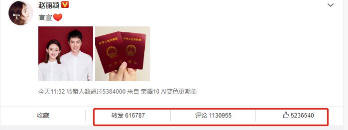 很直观的一个数据就是,两个人公开的微博评论数...赵丽颖转评赞均是60万+以上,点赞更是达到了523万+。