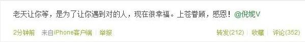 随后,冯绍峰就在微博上公开了,还说“老天让你等,是为了让你遇到对的人。”