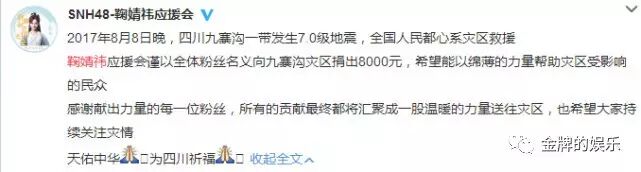 前天,九寨沟地区发生了灾情,造成了重大财产损害和人员伤亡,在得知这个消息后,鞠婧祎的粉丝团们也是在第一时间响应。