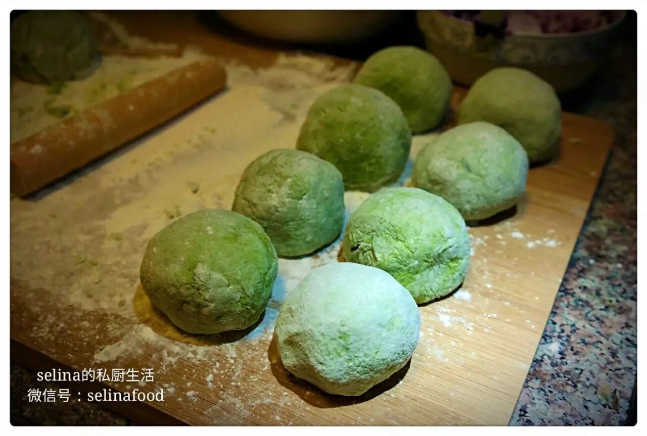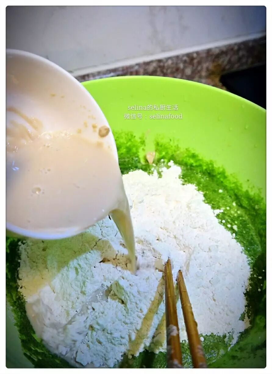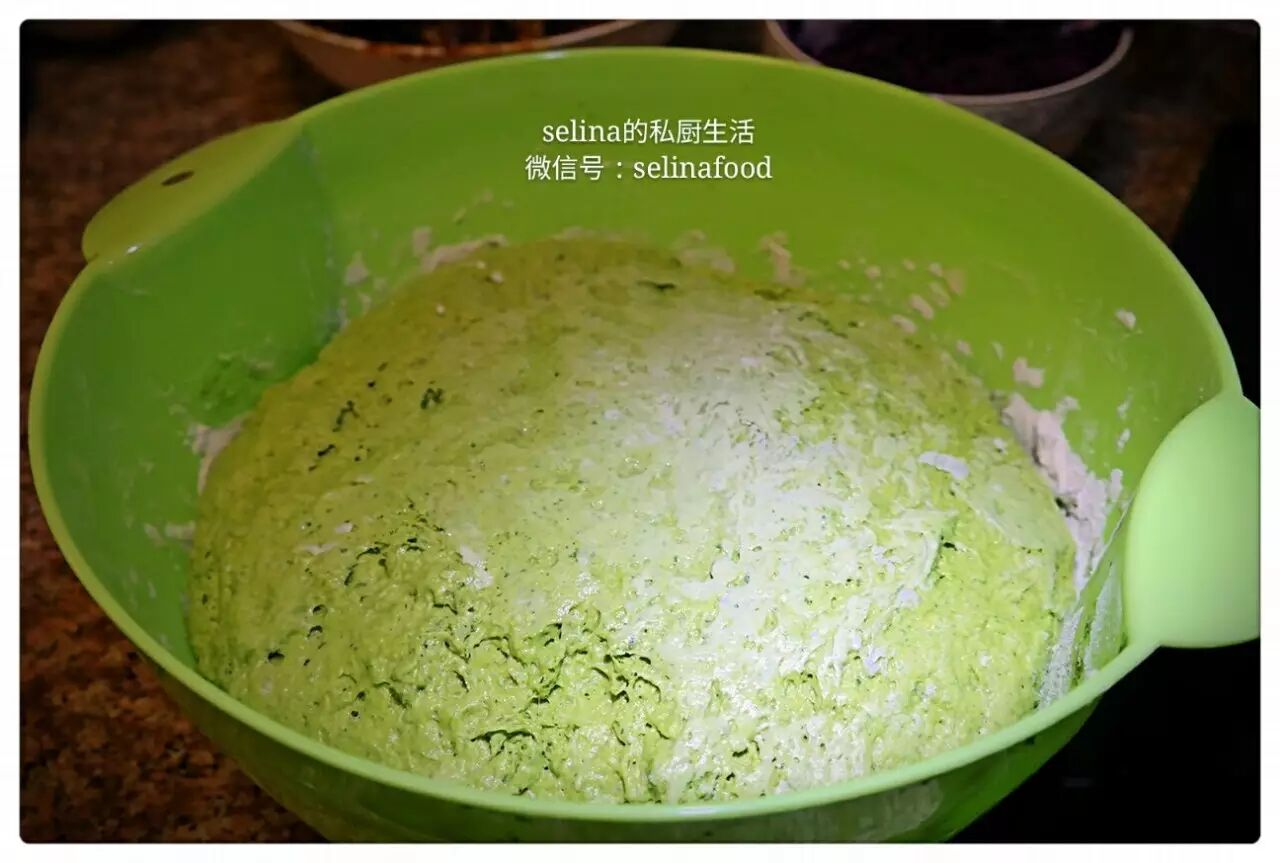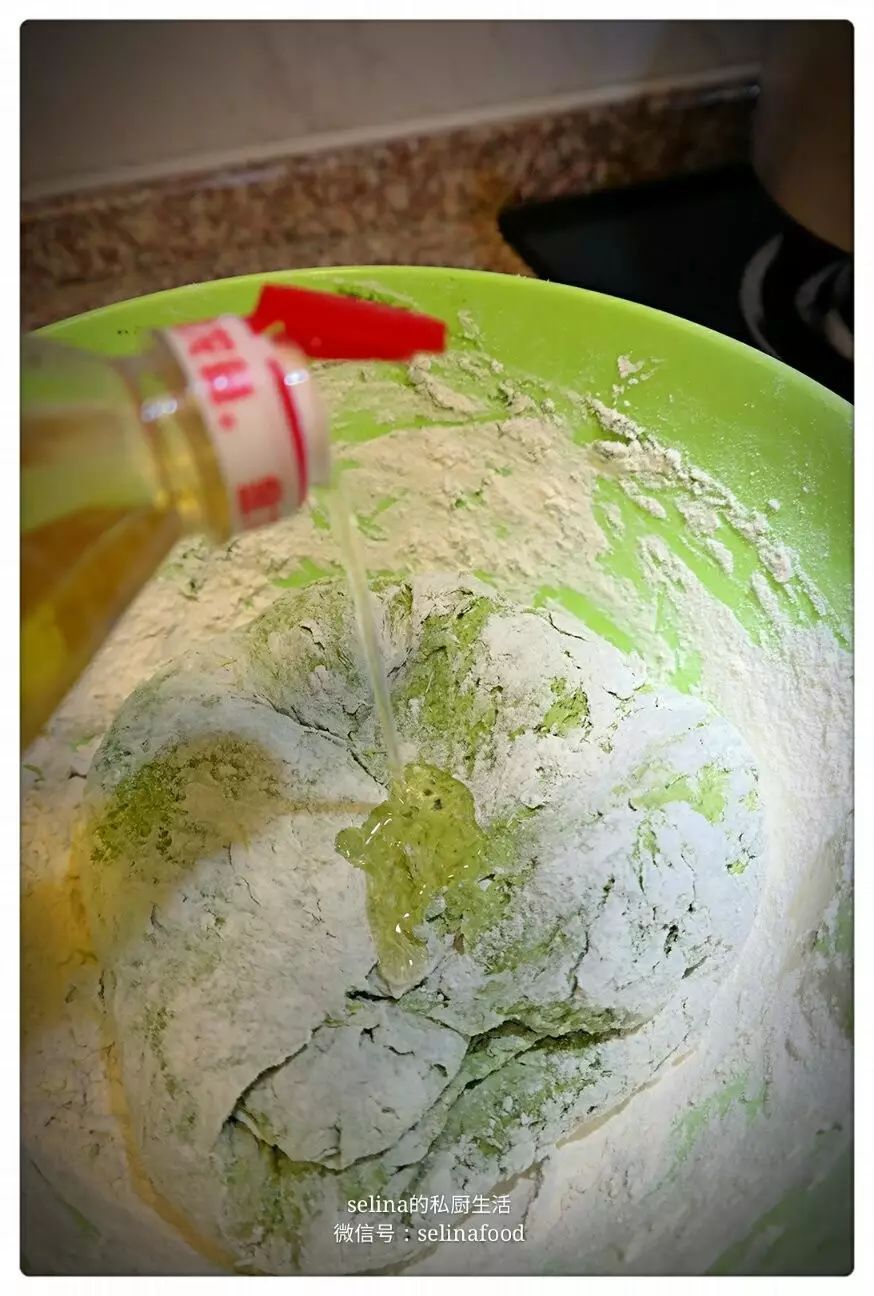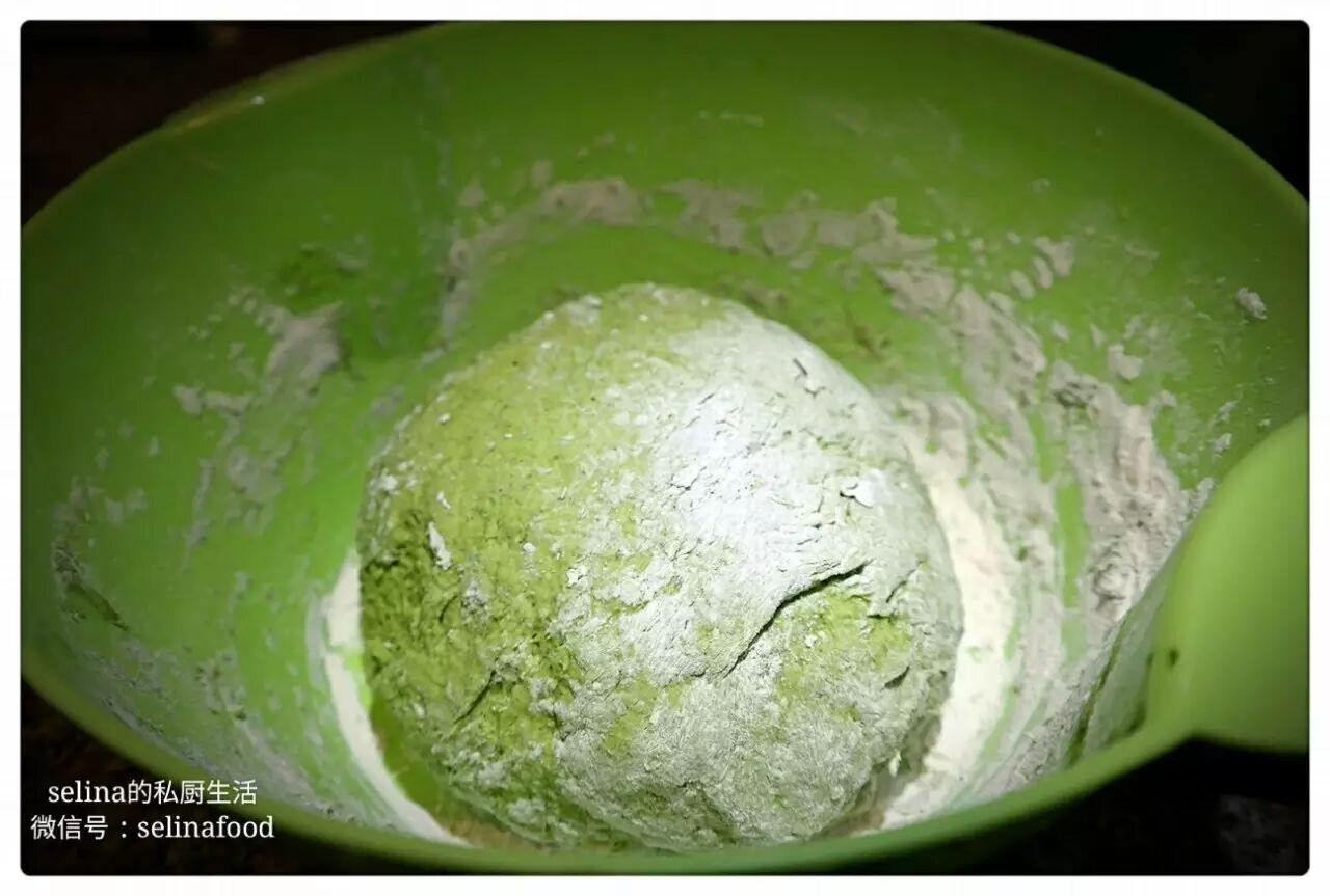 还有用温水调开的酵母水,与面粉和菠菜汁充分融合,和面至不粘手为佳。