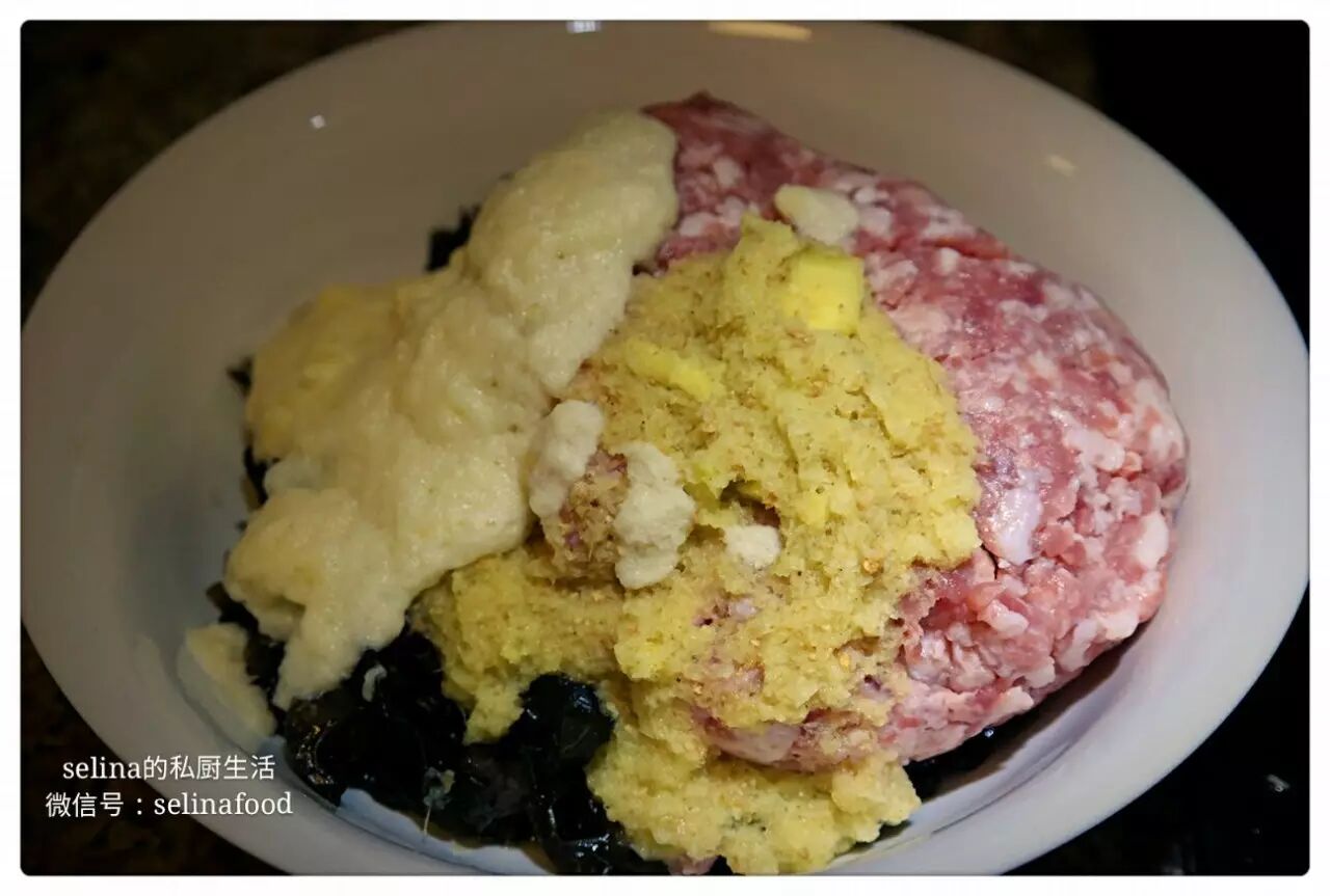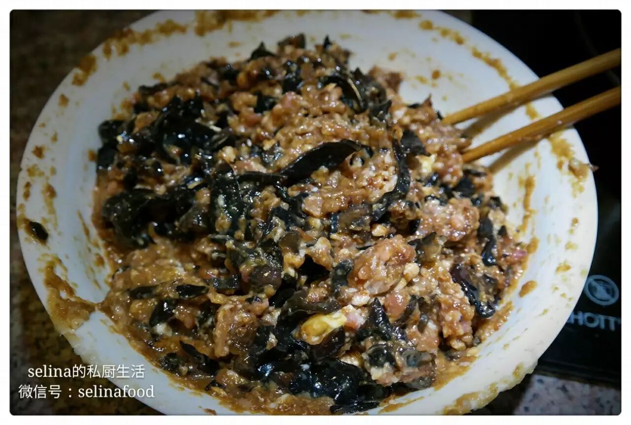 有甜的,还要做个咸的馅!木耳剁碎加上肉糜、姜蓉、蒜蓉为材料做的肉馅。