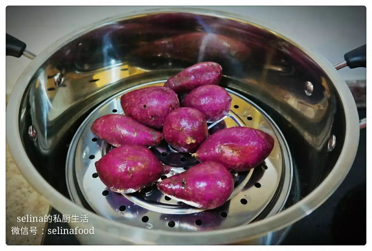 好了,接下来我要开始做甜甜的紫薯包子馅了!首先把紫薯洗干净,放到蒸锅里蒸大概15~20分钟即可。