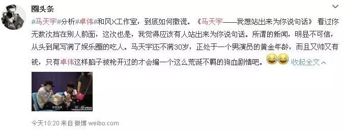 沉默一周后,马天宇昨天微博回应此事无中生有。