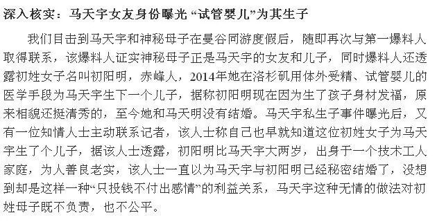 记者对马天宇非婚生子新闻也采访了其宣传人员,对方回应短发女生是他二姐,孩子是他外甥,没有什么大惊小怪的,该回应并没有提及马尾辫女子的身份;之后马天宇经纪人又表示:那对母子俩是马天宇朋友的妻子和儿子,与马天宇一起去普吉岛度假,朋友是先去的,因为怕新闻会影响到马天宇朋友一家的生活,希望息事宁人,就别报道了。