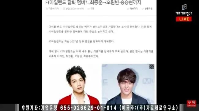YouTube频道《横竖研究所》日前更新最新内容,博主表示:「我不会说出具体名字,但可以告诉大家是前成员FT Island。这个组合非常有名,我不公开对方的姓名,是因为他现在经济状况非常差,所以才会被高额兼职广告诱惑,其实他也是被高酬劳给骗了,我还蛮心痛的,圈里有混得很好的爱豆演员,如果不是大型经纪公司出身的话,大部份都会遇到经济困难。」