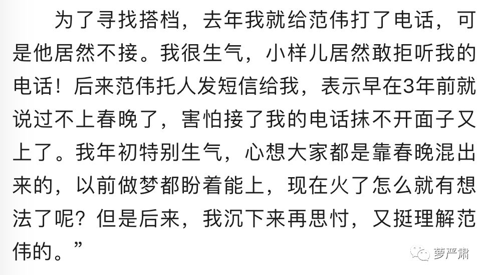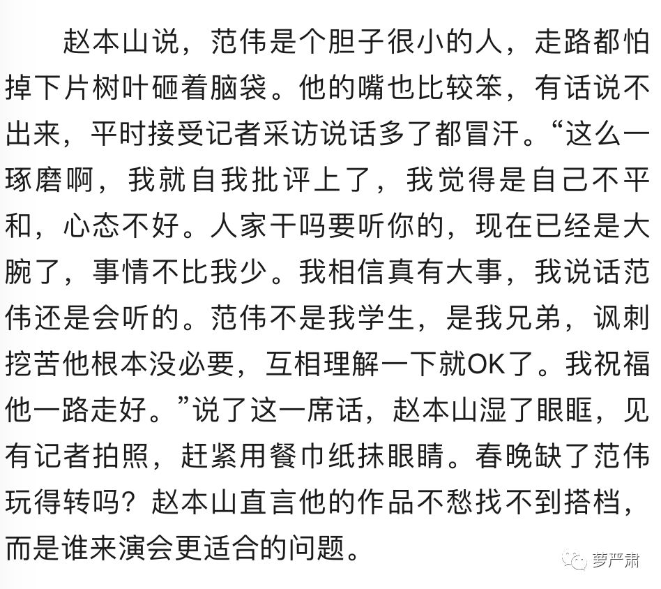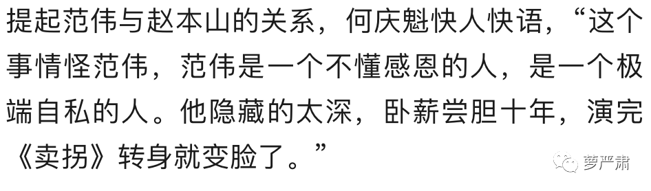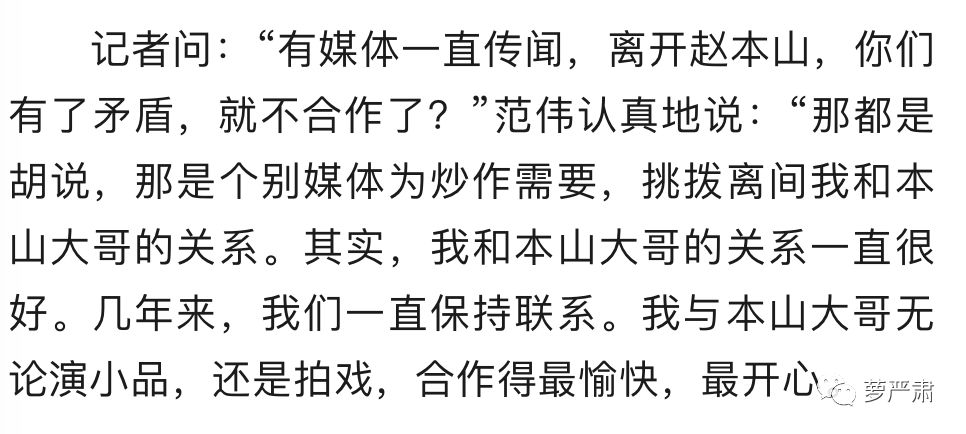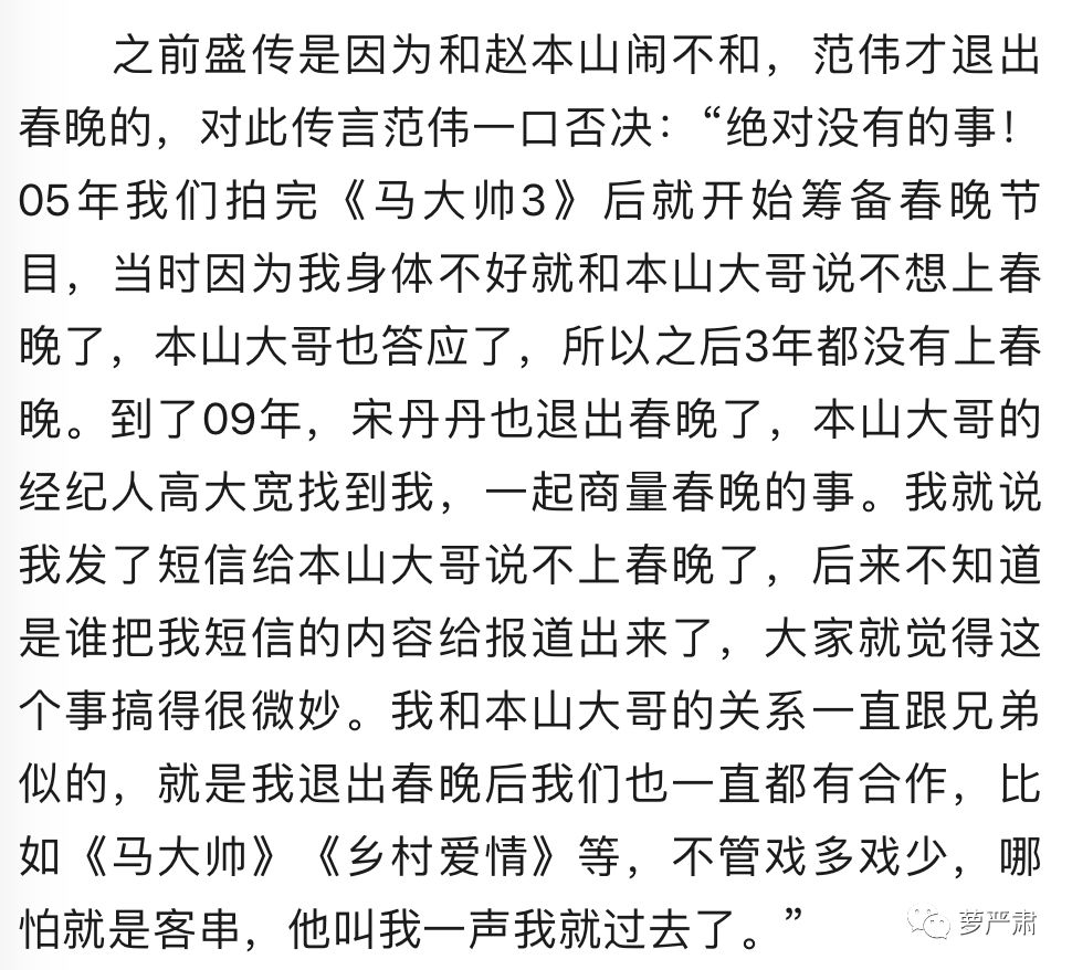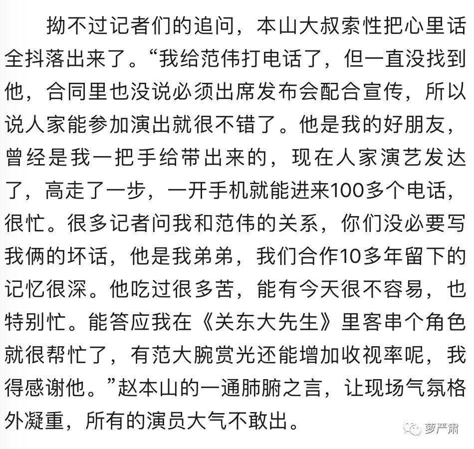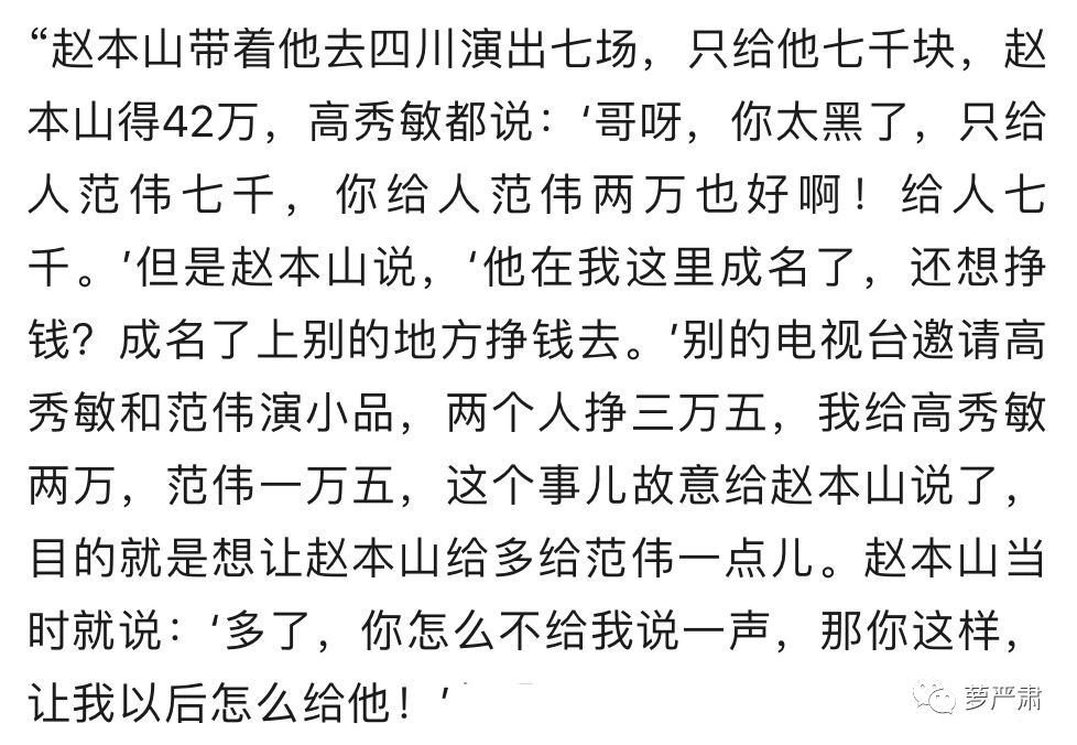 赵本山范伟,两条人生路 萝严肃 内地男星 2020-03-16 22:10:37 672 创作不易,用心坚持,欢迎请BaGua喝几杯爱心咖啡!打赏并支持本文 打赏并删除本文 转载或者合作请联系[email protected]《刘老根3》最初打出的宣传口号是赵本山范伟世纪重逢,再度合作,用网络流行词的话来说,这是“活久见”,“活久了什么都能见到”。因此,这曾经是我2020年最想看的电视剧。但是等播出我就发现,被“遛粉”了,演到第六集范伟迟迟不出现,男二不是药匣子而是他的儿子药丸子。范伟只是客串一下,跟综艺节目里搞怀旧是一个性质,扮上以前的打扮,用药匣子的口音,来个经典台词。这段“回忆杀”戏份,没有多少人在意。在如此特殊的一个春天,一个7分不到的电视剧当然不值当上热搜。本季《刘老根》的磨叽程度直追这几年的《乡村爱情》,相信很多人已经在前六集被遛粉的愤怒中弃番了,看不到范伟客串。更何况,还有很多年轻人根本不关心这场“赵本山范伟活久见”了。我带着怀旧打卡的心情拉了一下剧情。怎么说呢,这段戏好像是把赵本山和范伟真人的重逢演了一遍。回忆往昔、流泪、拥抱,确认彼此有一段珍贵的记忆,然后,再见。《刘老根3》里如果还有什么可看的,就是赵本山浑然天成的演戏方式,可能也不需要演,就是他自己,一个成功了一生,老来有些寂寞困顿,对新世界渐渐无力还在保持微笑、喜欢拉二胡的老人。谁还记得他当“小品王”的那些年里,他的一举一动都是新闻,所有都市报的文娱版都对准了他。在赵本山的时代,东北的娱乐记者认为,世界上只有一种娱乐头条,那就是赵本山。赵本山的小品电视剧戏里戏外乃至他的一根头发都可以是新闻,春晚前后,一个都市报娱记只要跟赵本山团队搞好关系时时拿点回应,就可以挣够工分了。真顶流也。张柏芝出现在赵本山的私人飞机上,网传陈乔恩可能跟赵本山合作,这被视作她在大陆娱乐行业发展极好的机会。只要有赵本山领进门,小沈阳就能一炮而红,但人们又不厌其烦地猜测着师父多么有统治地位。十年前,赵本山和范伟不再合作,是一个血雨腥风的大新闻。标志性分手事件是这样的:赵本山公开含泪说打不通范伟电话。2009年年初赵本山和赵家班的电视剧《关东大先生》开播,这个戏曾经万众期待,也被视作赵本山推弟子的重大尝试(第一男主角是他的徒弟张小飞),但在其中客串的范伟没有去开播发布会。赵本山对着记者忽然就开启了倾诉模式,要搁热搜时代,关键词就是:赵本山含泪、范伟不接电话、赵本山范伟分手、赵本山说范伟胆小、范大腕赏光、范伟怕树叶砸脑袋。因为发布会上记者们都问范伟去哪儿了,赵本山就直接说给范伟打过电话,找不到人,范伟是自己带出来的,但现在是“范大腕赏光”……怨念满满。范伟最后一次跟赵本山演春晚小品是2005年的《功夫》,之后范伟再也没上过央视春晚。赵本山对此加码爆料,称宋丹丹身体不好,他想找范伟再合作春晚小品,范伟不接电话,以前做梦都盼着上春晚,“现在火了怎么就有想法了呢?”分道扬镳金句:“范伟是个胆子很小的人,走路都怕掉下片树叶砸着脑袋。”(△京华时报:《关东大先生》首播发布会,范伟又缺席本山闪泪花)赵本山诉说着自己说话在范伟那儿不好使,再说范伟胆小,说自己心态不平衡,并定性“范伟不是我学生,是我兄弟,讽刺挖苦他根本没有必要”。——但什么“范大腕”“走路都怕掉下片树叶砸着脑袋”之类的,很难不被视作讽刺挖苦。赵本山的态度看起来也不像是对兄弟,还是像对徒弟、对下属,埋怨的是对方竟然会逃避自己的邀请,但为什么不可以逃避呢?合作讲究个双向选择彼此尊重。范伟对这些话题的回应从来都是很谨慎的,几个月后范伟只说自己跟“本山大哥”发过短信说不上春晚了,二人关系一直是兄弟,叫客串就会去。(△成都晚报:回应与赵本山“不和”传言,范伟:我们关系好得很) 事实上两个人也没有因为“掉树叶都害怕”的那次开炮怎么样,根据2010年年底《华西都市报》的报道,2010-2011深圳卫视跨年晚会上,赵本山和范伟还在休息室里有说有笑。范伟当时对媒体说的是,为了孩子受更好教育而希望调到北京工作,赵本山还帮忙了。此外范伟还说“不和”是媒体恶意炒作。可是,明眼人都知道,赵本山发布会上那段曲里拐弯的话,比媒体风言风语影响力大得多。(△范伟回应为何离开赵本山:为了孩子受好的教育)2011年《建党伟业》里,范伟演黎元洪,赵本山演段祺瑞,“赵范再同框”也是大新闻,甚至有媒体写了“相约春晚再合作”的标题。《建党伟业》的片场花絮里,刘德华、赵本山、范伟几个人相互看手相、看面相,貌似也是其乐融融。本来“赵范不和”的事情差不多也就消停了,2013年忽然又爆了个重磅,赵本山合作编剧何庆魁在一个活动上,一方面说赵本山给范伟的片酬极为苛刻和抠门,一方面又说范伟这个人不懂感恩。何庆魁说,赵本山带着范伟演出,自己拿42万,只给范伟7千,理由是“他在我这里成名了,还想挣钱?”何庆魁故意多给范伟钱,赵本山还不乐意:“那你这样,让我以后怎么给他!”看起来分明是爆了赵本山的黑点,何庆魁最终的攻击点是范伟,说自己帮过范伟,范伟都三四年不跟他联系了,得出结论“范伟不知道感恩”“极端自私”,认为赵范分家,责任在于范伟演完《卖拐》就变脸。但是这个爆料发到新闻里,网络上普遍