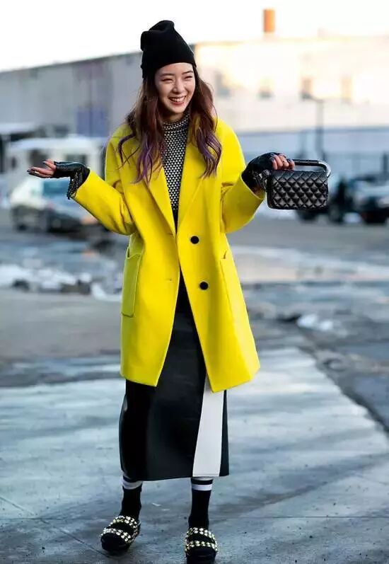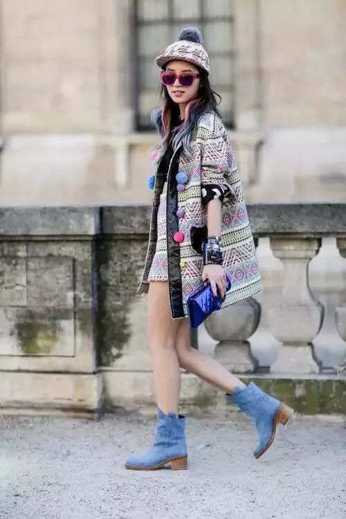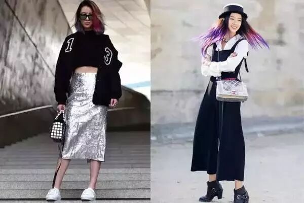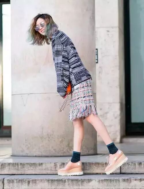 这身是小编最喜欢的一套了,孔雀蓝浴袍中款外套搭彩色伞裙,既时髦又复古,脚上又随性搭一双运动鞋,这样的姑娘惊艳得像一盒彩虹豆。