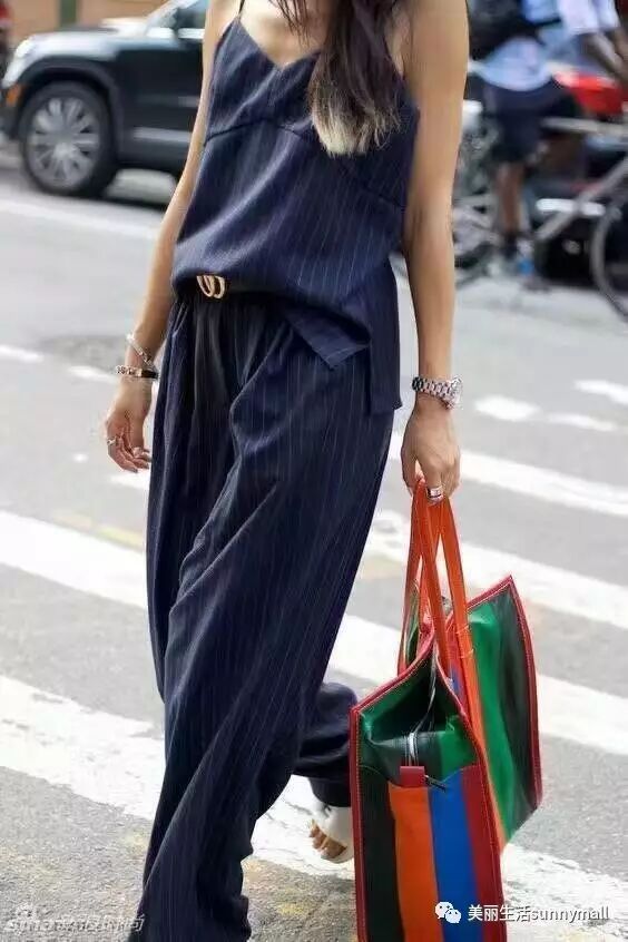 能从视觉上拉伸线条的深色竖条纹是春季套装的首选,结合垂顺的材质让整体造型更飘逸。上衣1109元、长裤 1003元