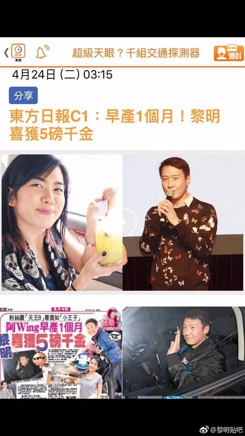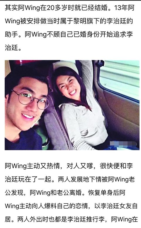 黎明的情史也在当了爸爸之后再次被翻了出来,现在的妻子大家都知道了,叫做阿wing,原来是李治廷的女助理,也跟李治廷传过很久的绯闻。