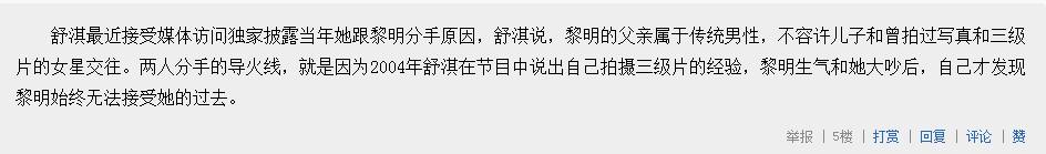 两人最后彻底分手的原因也是舒淇后来才说的,还是跟她的出身有一定的关系,黎明本身有点介意,家里人也比较介意。