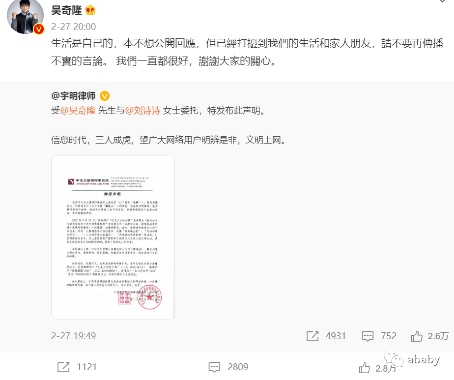 前阵子还有网友们不断地爆料刘诗诗吴奇隆婚变,原因竟然是吴奇隆和自己的助理出轨。当时这个谣言引起网友们的热议,随后吴奇隆和刘诗诗都分别出来辟谣,表示他们夫妻俩很好,根本不存在婚变,希望网友们不要以谣传谣。