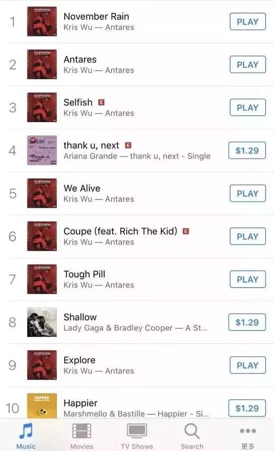 吴亦凡占据了iTunes单曲榜前十中的7个位子