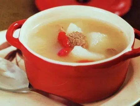 材料:羊肉300克,山药100克,枸杞20克,盐适量。做法:羊肉、山药洗净切片,与枸杞共入锅,用大火煮沸后改用小火炖至羊肉熟烂。加少许盐调味即可。此汤功效:经常吃羊肉既能够御风寒,又可以补养身体,对一般风寒咳嗽、虚寒哮喘、腹部冷痛、体虚怕冷、病后或产后身体虚亏等虚状均有补益效果。