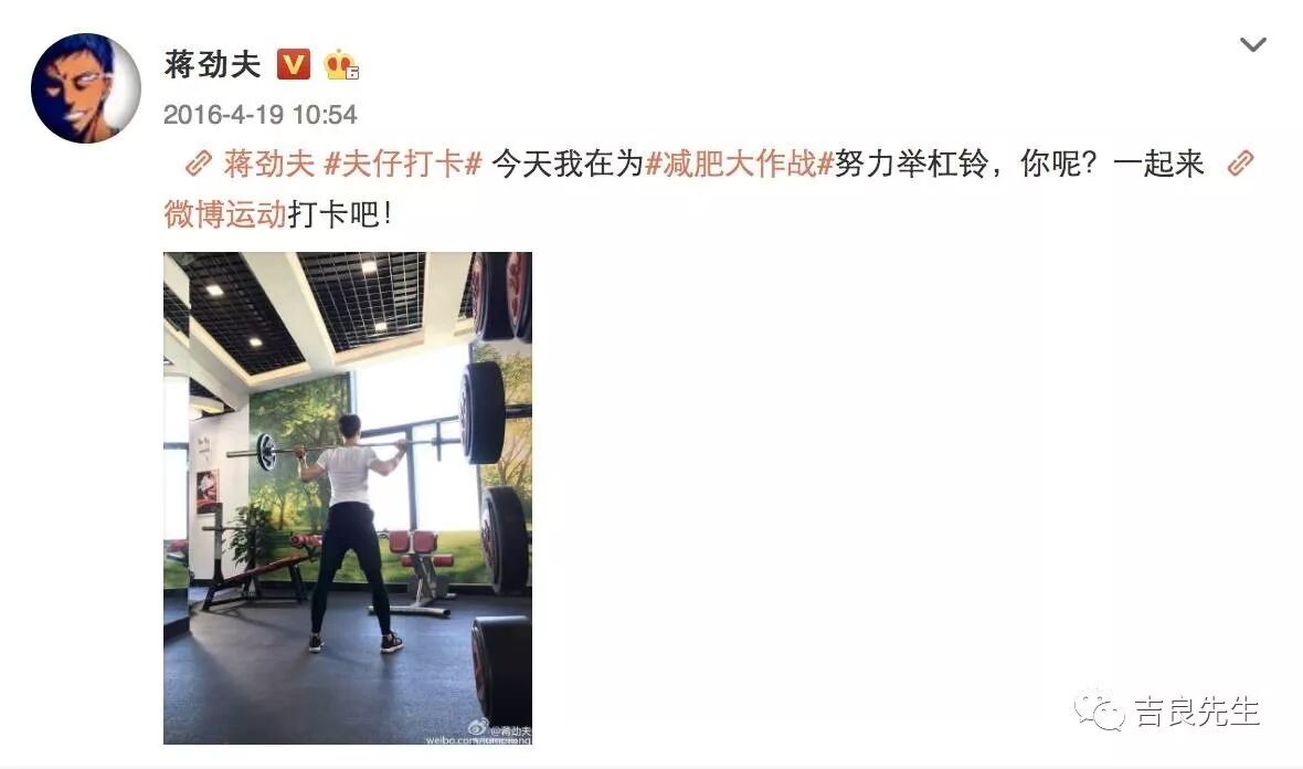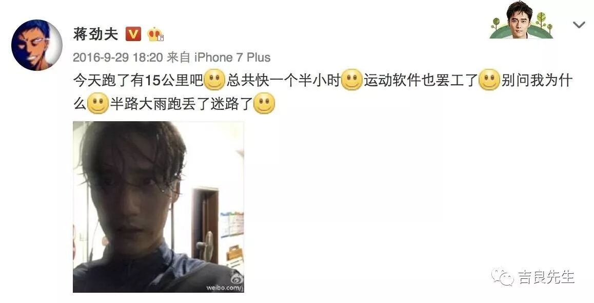 蒋劲夫曾经是国家二级运动员,爱跑步的他时不时就会在微博上打卡,每次都是15公里往上走。