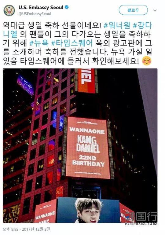 美国大使馆也关注姜Daniel的生日。粉丝们租借纽约时代广场的大屏幕,播放了其生日广告,实属罕见,从侧面能看出粉丝团的规模和组织能力。