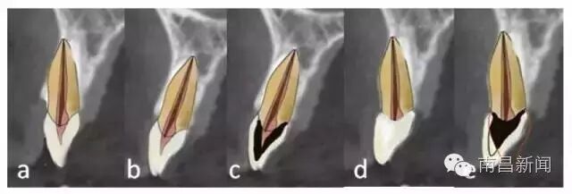 此时牙根在牙槽骨中的位置如图a所示,而正常的牙冠和牙根位置需要排列到图b的位置。如果在正常的位置上做烤瓷牙,只需要顺着牙齿长轴的方向磨除适量的牙体组织(图c为剩余牙体组织),并不会磨除到牙神经。而在美容冠的病例中,需要将牙冠放到图d的位置,而牙根在牙槽骨的位置并无改变,因此做完牙根与牙冠方向不一致,呈一定角度,咬合时会在牙颈部形成不良的应力,颈部容易折断或出现其他问题。