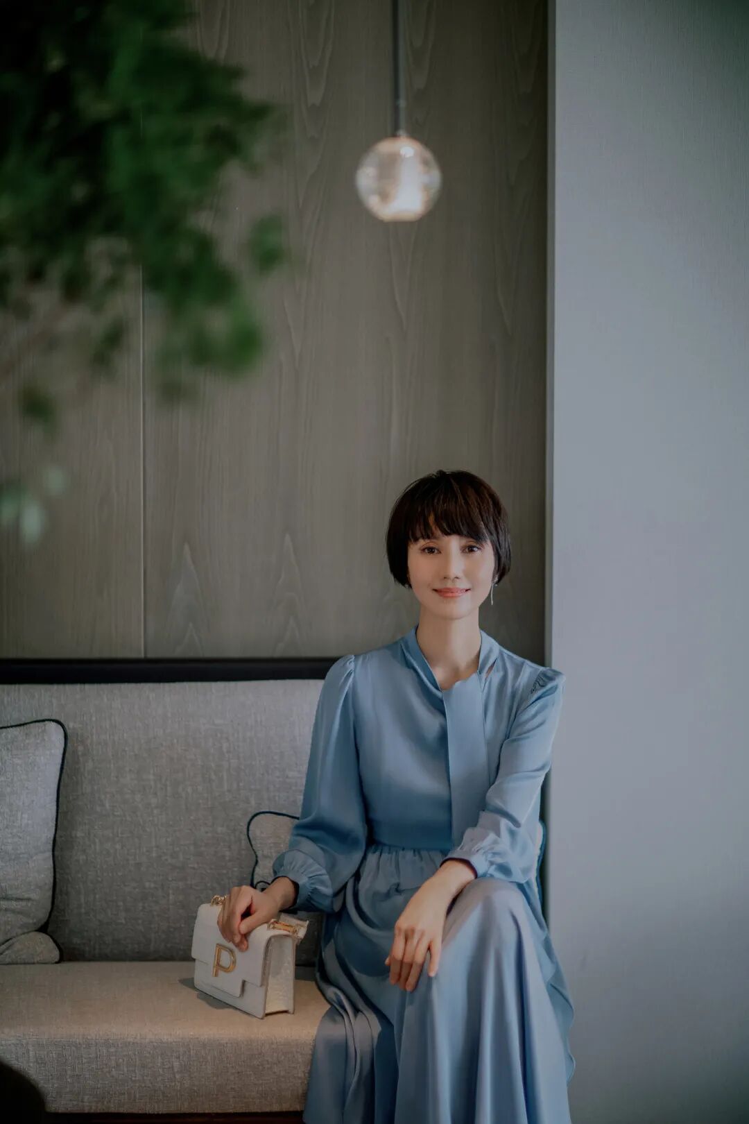 照片中,袁泉身着一条浅蓝色的连衣裙,淡妆短发、姿态优雅。
