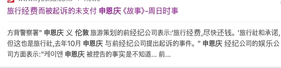 同时,所属社还出面控诉申恩庆在合作四年半中,欠公司2亿4千万多韩元(约人民币138万多)没有支付,为此所属社提交了诉讼。