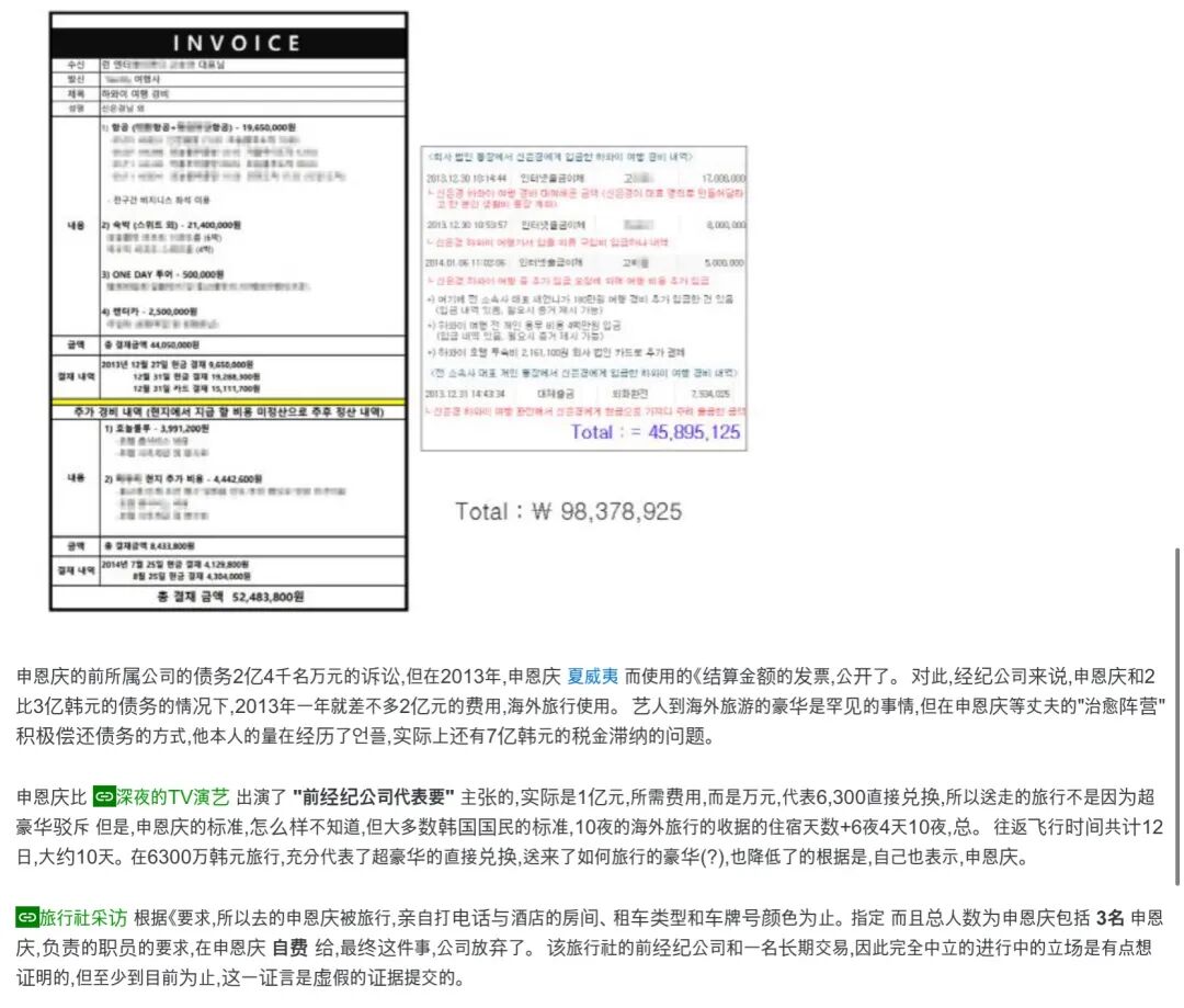 更重磅的是,所属社还公开了申恩庆2013年夏威夷旅游的支出明细和来往短信,称申恩庆在夏威夷度过了10天的豪华旅行,最后账单上先是的总费用高达9837万多韩元(约合人民币56.9万),更是曝光申恩庆有7亿韩元的税金滞纳问题。