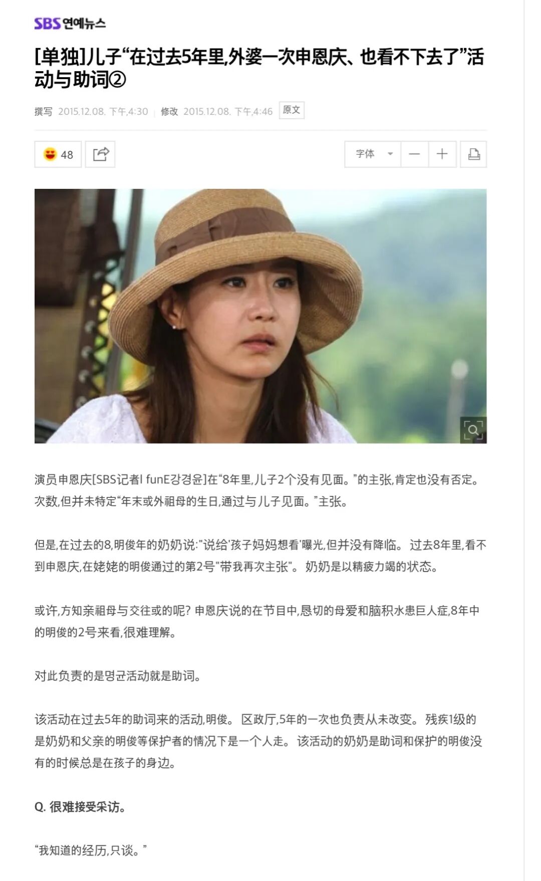 一方面,申恩庆的80多岁的婆婆称申恩庆弃养,说申恩庆八年来只看过儿子两次,抚养费也是经纪公司承担了一部分。对此,申恩庆晒出儿子的照片否认只看过儿子两次。