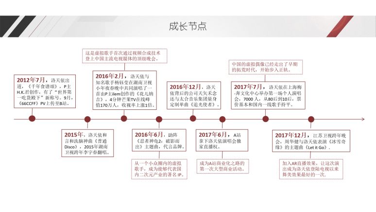 (7)2017年7月,洛天依在上海梅赛德斯-奔驰文化中心举办的演唱会吸引到了 7000 多名粉丝,从80后到10后,票价基本和国内一线歌手持平。第一场个人演唱会,也标志着,中国的虚拟偶像已经走出了早期的拓荒时代,开始步入正轨。