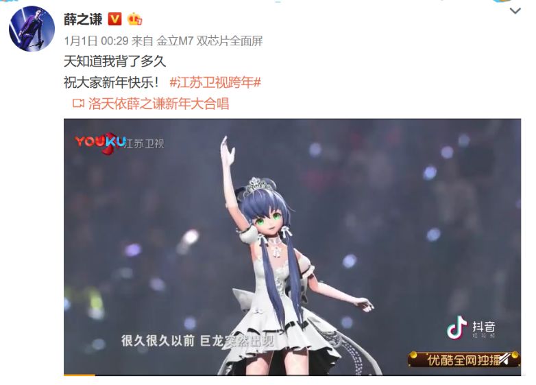 (9)2018年洛天依全面进军娱乐圈,开启了与各类明星的大规模合作,直到2019年江苏卫视跨年演唱会与薛之谦的合作引发全民讨论。