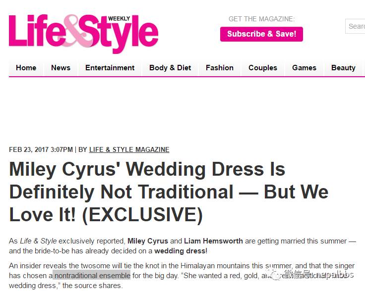 根据美国life&style生活时尚杂志独家报道:Cyrus和Hemsworth将选择在喜马拉雅山脚下尼泊尔永结同心。