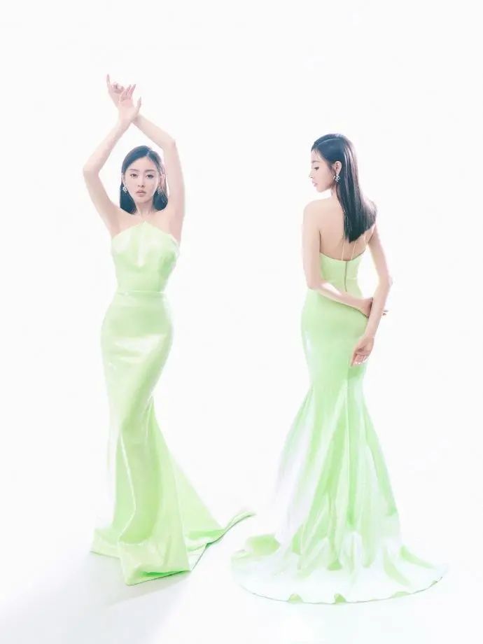 31岁张天爱不愧是时尚达人,穿一袭浅绿色鱼尾裙高级时髦,太美了!浅绿色抹胸连衣裙将张天爱的好身材淋漓尽致的展现出来,这款连衣裙有褶皱的设计,所以虽然是收腰包臀的连衣裙,但也完全不会让女性看起来太过臃肿肥胖,能够在很大程度上遮挡住多余的赘肉。这样的浅绿色非常显白,而且张天爱的身材纤瘦且有料,选择抹胸的造型再合适不过了。