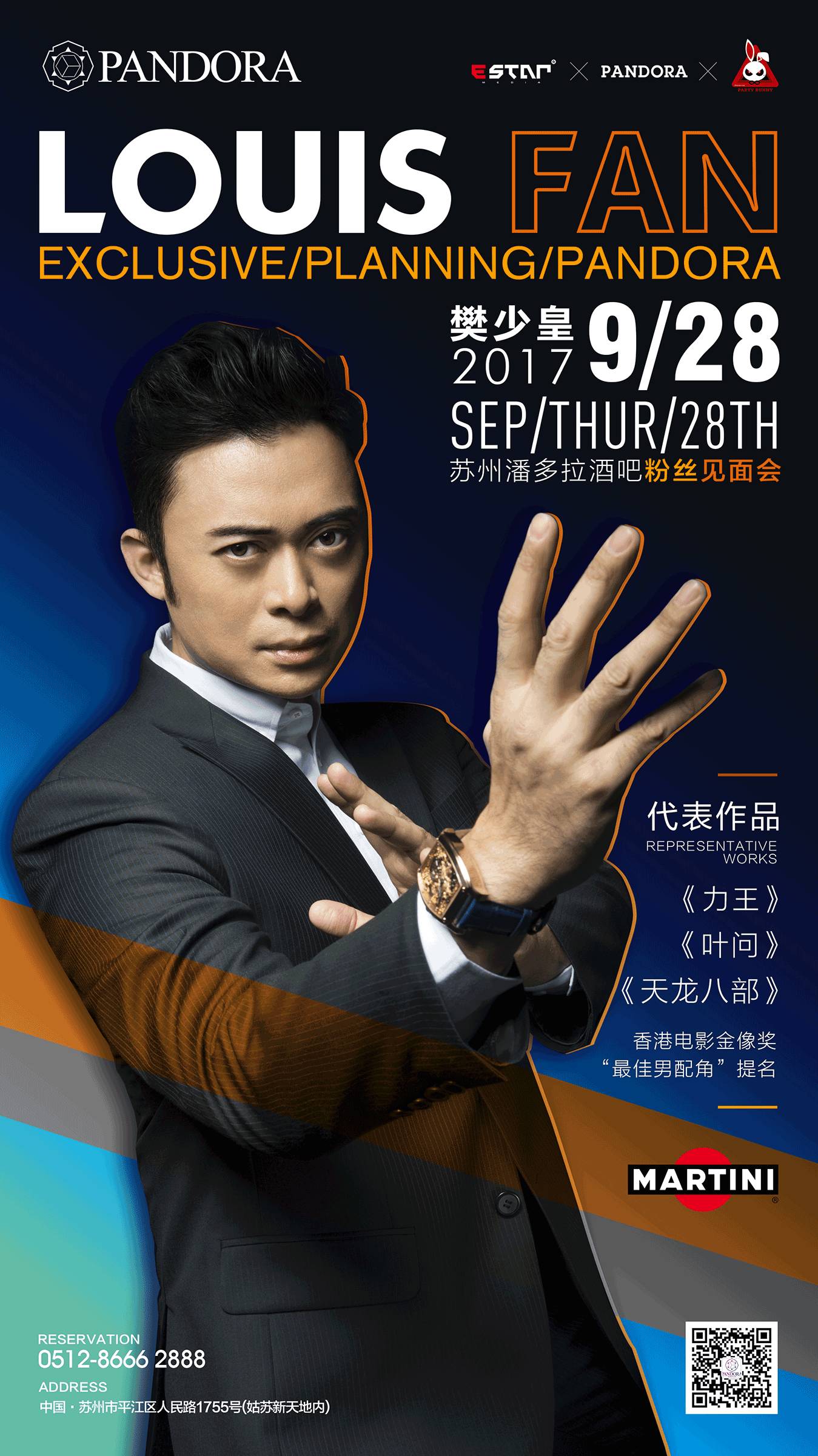 >>>>>>>> 功夫巨星 樊少皇 9/28 与你相约 潘多拉 大牌粉丝见面会 敬请期待 一 代 功 巨 星 樊少皇 樊少皇 自两岁开始,便随邵氏武打演员的父亲樊梅生接触电影圈。 1975年,他由童星演起,第一部参与作品是电影《法网难逃》。 1986年,他以童星身分续拍电影《妈咪再见》及《听不到的说话》。 1981年,11岁的时候,在张婉婷导演的《霸王别姬》里,出演少年程蝶衣。 1992年,参演功夫电影《力王》系列。 1997年,主演金庸改编的武侠剧《天龙八部》。 2008年,凭借《叶问》中金山找一角入围 第28届香港电影金像奖最佳男配角。 2010年,出演新版魔幻电影《倩女幽魂》和新版《楚留香新传》 。 2012年,出演梁羽生改编的武侠电视剧《新白发魔女传》 。 2013年,主演战争剧《兄弟们上》。 2014年10月参演《皇甫谧传奇》。 2016年参演电视剧《蜀山战纪之剑侠传奇》, 在剧中饰演公孙无我一角。 从习武并走上了影视表演的道路, 至今仍是影视圈炙手可热的演员,阳光的外型以及率真的性格受到广大影迷的追捧。 尤其是其真实的 武打能力和硬汉形象 更让人过目不忘。 论身手,他屈指可数,论唱功,他独领风骚。 走下荧屏,相约潘多拉。 9/28 影视巨星触手可及。 当日入场门票现已开始发售 数量有限 售完即止 获票方式: 一、发送购买需求至潘多酒吧官方微信公共平,将由小编亲自为您服务