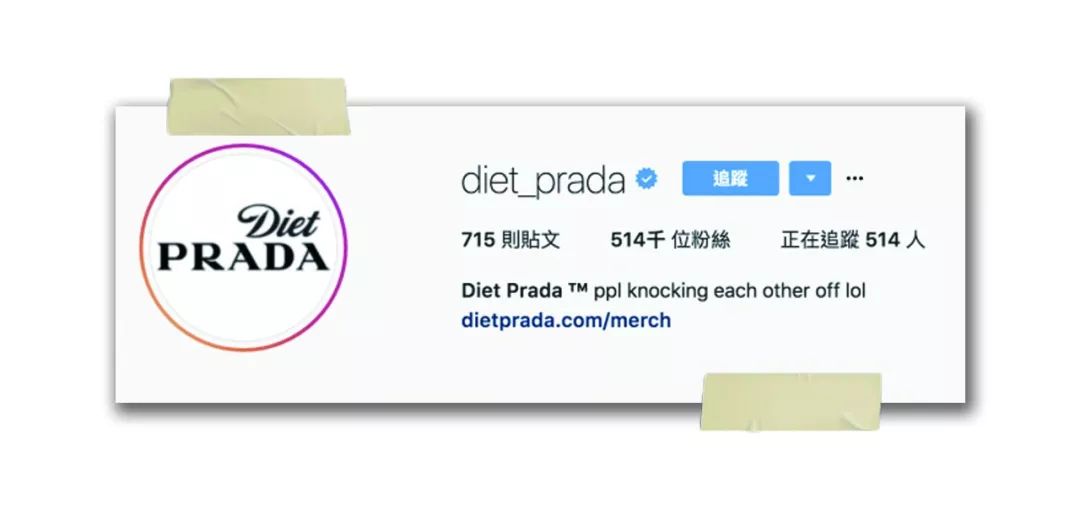 @diet_prada这个名字来于他们是Prada的粉丝,他们认为很多羽毛、莱茵石这种少女感的经典LOOK都被其他品牌借鉴,是设计的开创者;以及Diet Coke健怡可乐里的代糖,是原创(糖)的模仿者(代糖)。