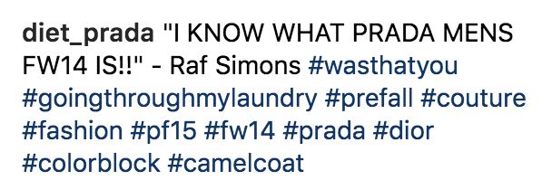 第一个被他们点名的是Raf Simon给Dior Pre-Fall 2015设计的一件外套,很有Prada 14年男装的影子,并给Raf Simon配了字幕说“我知道Prada FW14的男装长什么样!#洗完变成我这件缩水版女装”其后开始call out各种大小品牌,残酷的外表配上有趣的文字,笑倒很多粉丝。
